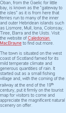 Oban can be accessed by rail service operated by Scotrail, by scheduled coach service operated by Scottish Citylink or, of course by car. It takes just over three hours by train and approximately 2½ hours by car from Glasgow.